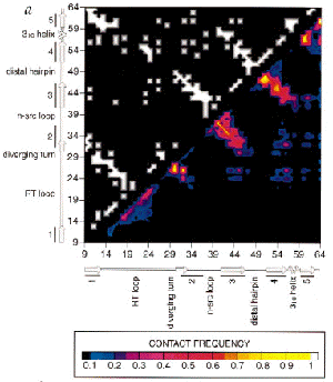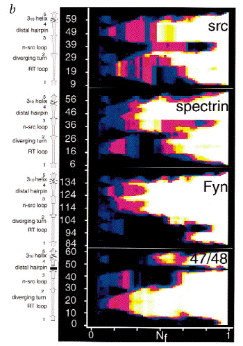 Theoretical analysis of SH3 folding. a, Ab initio simulation of src SH3 folding using ROSETTA. All SH3 domain structures were removed from the data base of short fragments used for building up conforma-tions. A total of 500 independent simulations were carried out, and all conformations from the 20 trajectories that produced structures within 4.5 A r.m.s.d. of the native structure were combined to calculate the frequency of side chain¡Vside chain contacts for each pair of residues in the protein (lower right triangle; color scheme is shown below the figure). For comparison, the contact distribution in the native structure is shown in the upper left. b, Hierarchy of SH3 domain folding in model calculations based on native state topology. Calculations were performed on the src, spectrin and fyn SH3 domains and the 47¡V48 circular permutant of the spectrin SH3 domain in which the distal hairpin has been cut. The reaction coordinate, Nf, is the fraction of ordered residues (Nf = 0 is the fully unfolded state and Nf = 1 is the fully folded state). The y-axis indicates position along the sequence. All configurations of the system were enumerated, and the Boltzmann averaged frequency of ordering of each residue, as a function of Nf, is indicated by the color (black-blue, 0¡V0.25; blue-magenta, 0.25¡V0.50; magenta-red, 0.50¡V0.75; red-yellow, 0.75¡V0.88; and yellow-white, 0.88¡V1.00). It is important to note that segments of the protein not contiguous along the sequence still interact in the model if contacting in the three-dimensional structure, for example in the top panel, the high population of the diverging turn/strand 2 and the distal loop b-hairpin at Nf = 0.6 indicates that more surface area is buried within and between these structural elements than within any other substructure with the same number of residues ordered in the protein. (Figure adopted from Riddle et al., Nat. Struct. Biol., 1999, 6(11):1016) |