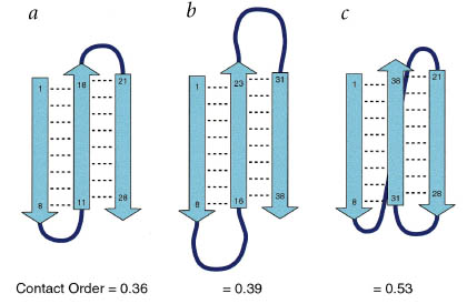 | Contact order is related to secondary structural content. Yet, helices are characterized by numerous i, i+3 contacts orders of helical proteins tend to be low and thus there is a significant correlation between contact order and helical content (r = 0.72; p = 0.009). This suggests that contact order is a important determinant of protein folding kinetics. | |