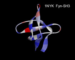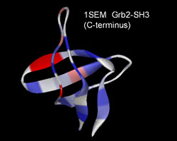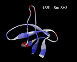 | Ribbon diagram of six Src-Homologous 3 (SH3) domains. The colors are shown according to the hydrophobicity of each residue. Images were created by WebLab Viewer 3.0. |