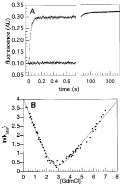 | (A) Refolding kinetics of src SH3 in 0.4 M GdmCl at 295 K followed by stopped-flow fluorescence. The slow phase due to proline isomerization accounts for ~10% of the total change in signal. The baseline for the denatured protein in 0.4 M GdmCl is assumed to be the same as that in 4 M GdmCl since equilibrium GdmCl denaturation did not reveal any dependence of the fluo-rescence signal of the unfolded protein on GdmCl. (B) GdmCl dependence of ln kobs at 295 K. Closed circles are averages of the rates obtained from 5-7 folding or unfolding experiments at a particular GdmCl concentration. (Figure adopted from Grantcharova and Baker, Biochemistry, 1997, 36(50):15685) | |||