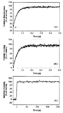 Native levels of both intrinsic fluorescence (97 ( 3%)(A) and peptide binding activity (95 ( 6%) (B) are recovered with effectively identical kinetics (25.6 +/-1.2 and 23.7 +/- 2.0 s -1 , respectively, in 0.727 M GuHCl at 20 ¢XC). Consistent with this observation, the native NMR signal intensity (95 ( 8%) is recovered within the 2 s dead time of kinetic NMR measurements (C), indicating that a native core geometry is recovered within that time frame. The expected fluorescence of the unfolded protein in the refolding buffer (40%) is indicated in (A) by an arrow. It was calculated by linear extrapolation of the fluorescence of denatured Fyn-SH3 at high GuHCl concentrations. (Figure adopted from Plaxco, et. al., Biochemistry, 1998, 37(8):2529) | |