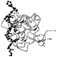 | Diagrammatic representation of the Fyn-SH3-peptide complex. The peptide is shown in ball-and-stick representation, while the protein is shown as a backbone worm. The structure of Pro134 is clearly constrained by Trp119 and Tyr137, and this observation, together with molecular dynamics simulations ,strongly suggests that a cis-proline cannot be accommodated at this position without significantly disrupting both the peptide binding surface and the intrinsic fluorescence of the protein. | ||