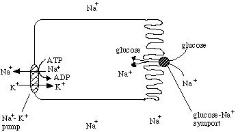 This system is used in a novel way in human gut epithelial cells. These cells take in glucose and Na+ from the intestines and transport them through to the blood stream using the concerted actions of Na+-glucose symports, glucose permeases (a glucose facilitated diffusion protein), and Na+-K+ pumps. Note that the epithelial cells are joined together by tight junctions to prevent anything from leaking through from the intestines to the blood stream without first being filtered by the epithelial cells.