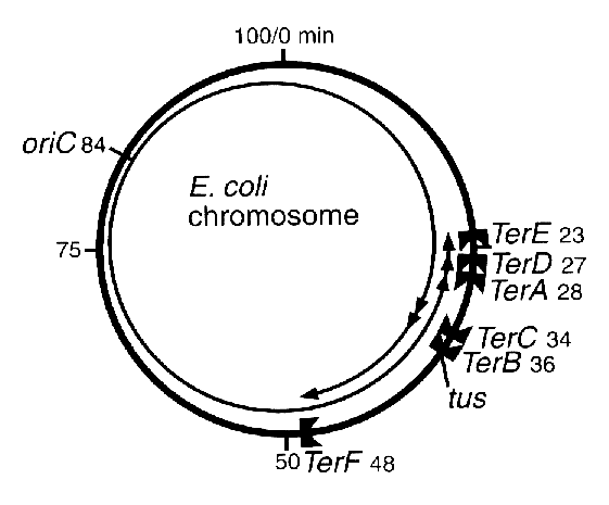 The locations of the six terminus sites, replication origin (oriC ) and the tus gene. The symbols on the outer ring denotes the DNA-replication-terminus (Ter ) sequence that blocks the replication fork approaching from the side towards the cut out arrowhead. |