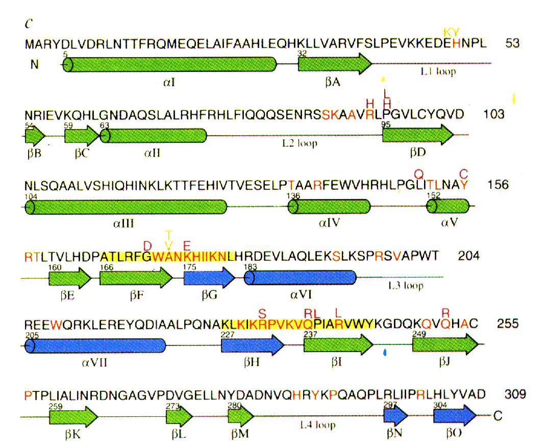 Residues in the interdomain beta-strands, which form the main elements for DNA recognition, are highlighted with yellow, and residues that interact with the DNA are indicated by red letters. Mutant residues are represented by violet and orange latters. |