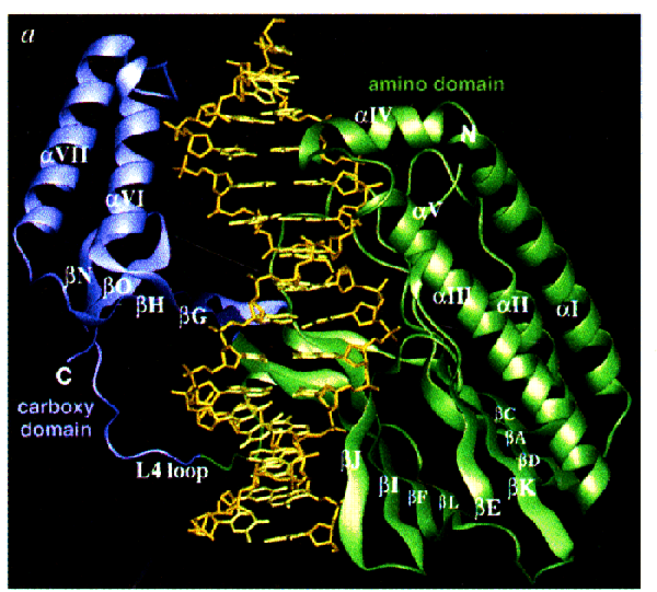 Amino and carboxy domains are colored green and blue respectively. The backbone of DNA is colored yellow, and the bases of DNA are colored orange.