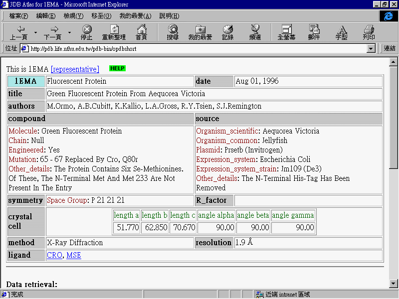 1. Please find the 1.9 A crystal structure of the Aequorea victoria green fluorescent protein (GFP) from PDB. Give the following informations: