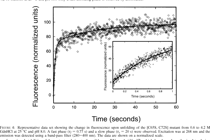 and Pro114. The slow fluoresence unfolding phase is independent of pH and [GdnHCl], and has an activation energy of 20kcal/mol, which strongly suggests that the slow phase correspons to the isomerization of Pro93 and Pro114. Next |