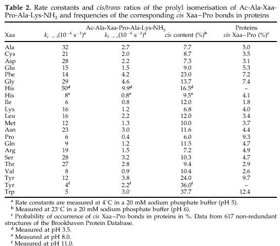 position. Aromatic side-chains result in slow isomerization, the rate constants decrease in the order Phe>Tyr>His>Trp. Slow isomerization is also observed when aliphatic side-chain precede proline. The slowest reaction in this group are caused by beta-branched a.a.--Val, Ile. |