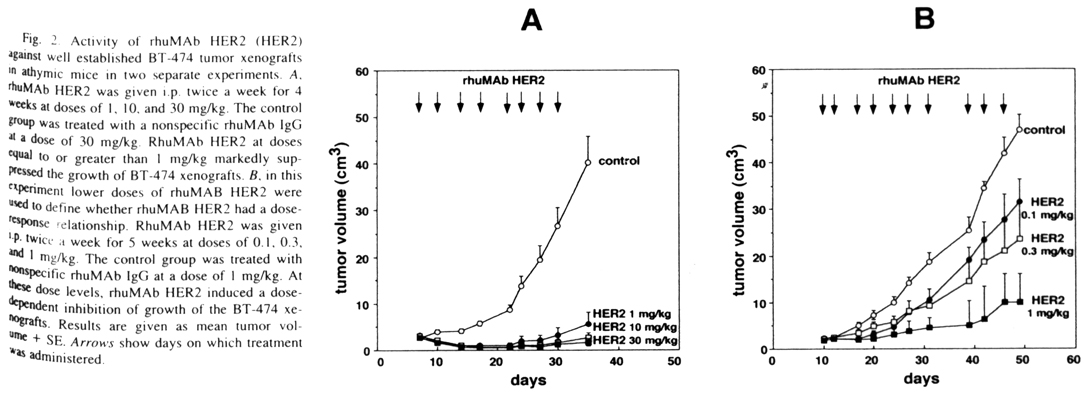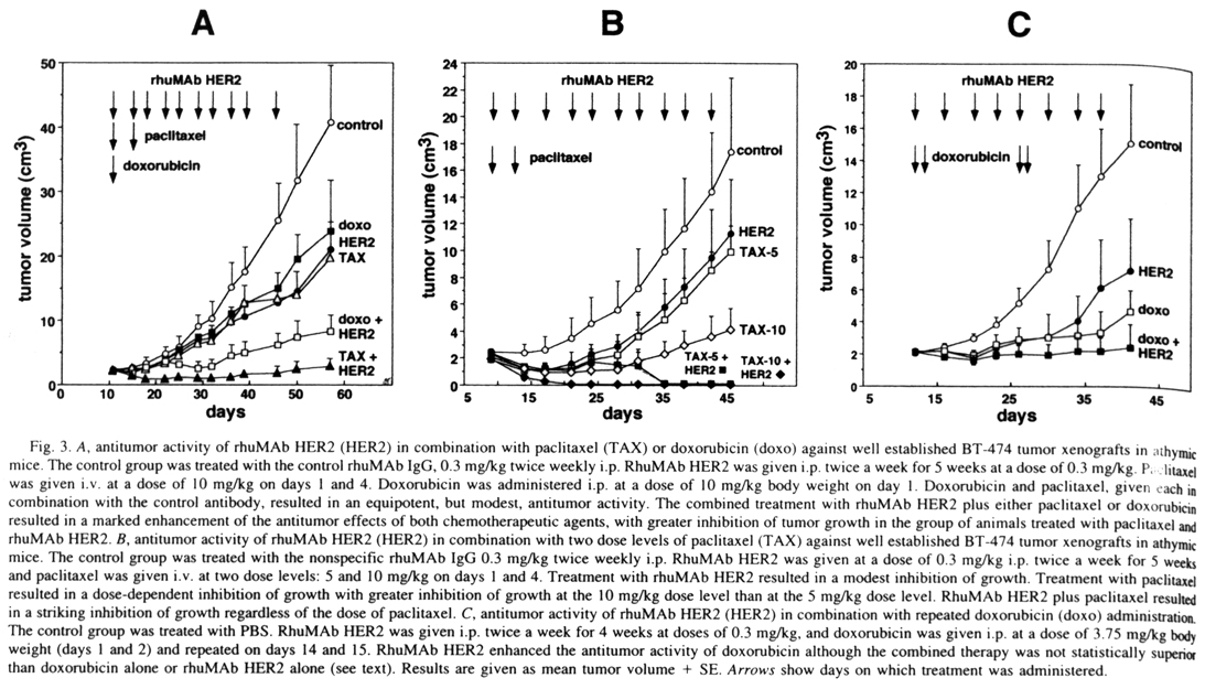 在進行臨床實驗前必須先要建立動物模式,以了解新藥是否有其效果。此篇作者自Genentech公司取得rhuMab HER2抗體,在癌細胞與移植腫瘤的老鼠身上試驗其效果,並且與其他用於化學治療的藥物同時施用,以比較rhuMab HER2抗體在動物體內的療效。