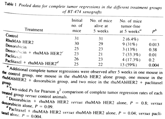 實驗結果總結:rhuMab HER2抗體能抑制癌細胞,提高老鼠的存活率。再與其他藥物配合之下,更能有效地抑制癌細胞的增殖提高個體的存活。